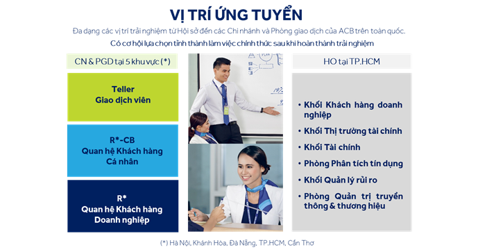The Next Banker đa dạng hóa các vị trí trải nghiệm từ Hội sở đến các Chi nhánh và Phòng giao dịch của ACB trên toàn quốc. Bạn có thể tham khảo thông tin ứng tuyển sau: