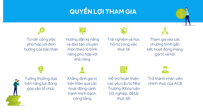The Next Banker là chương trình được ACB thiết kế dành riêng cho các bạn sinh viên năm cuối, mong muốn tìm hiểu về lĩnh vực tài chính ngân hàng và trải nghiệm công việc thực tế của một “Banker”. Với The Next Banker, sinh viên sẽ có cơ hội vận dụng những kiến thức đã học từ nhà trường vào thực tế, rút ngắn lộ trình trở thành nhân viên ngân hàng chính thức.