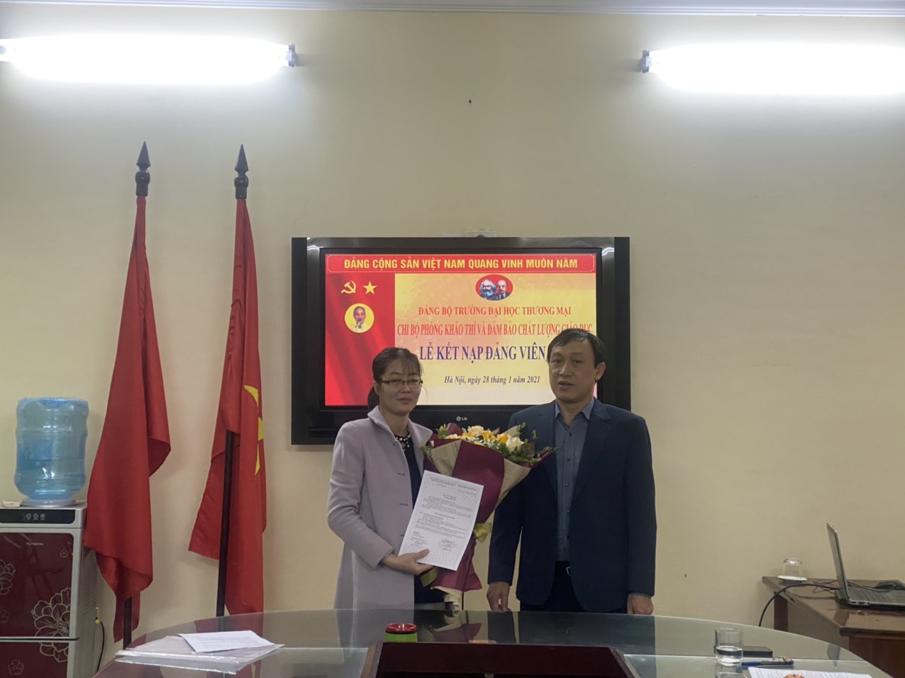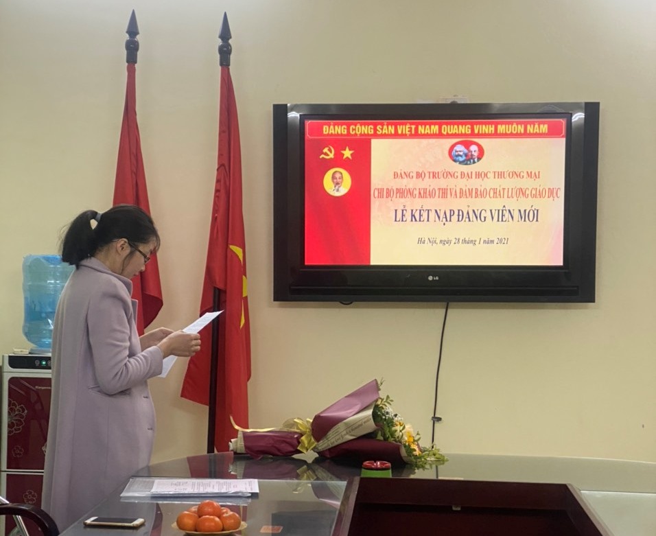 Căn cứ Quyết định kết nạp đảng viên số 16-QĐ/ĐU ngày 22/01/2021 của Đảng ủy trường Đại học Thương mại, sáng ngày 28/01/2021, Chi bộ phòng Khảo thí và Đảm bảo chất lượng giáo dục đã tổ chức Lễ kết nạp đảng viên mới đối với quần chúng ưu tú Trần Thị Thủy. Chủ trì buổi lễ là đồng chí Nguyễn Đức Nhuận – UVBCH Đảng bộ trường, Bí thư Chi bộ phòng Khảo thí và Đảm bảo chất lượng giáo dục cùng sự tham dự của toàn thể đảng viên trong chi bộ.