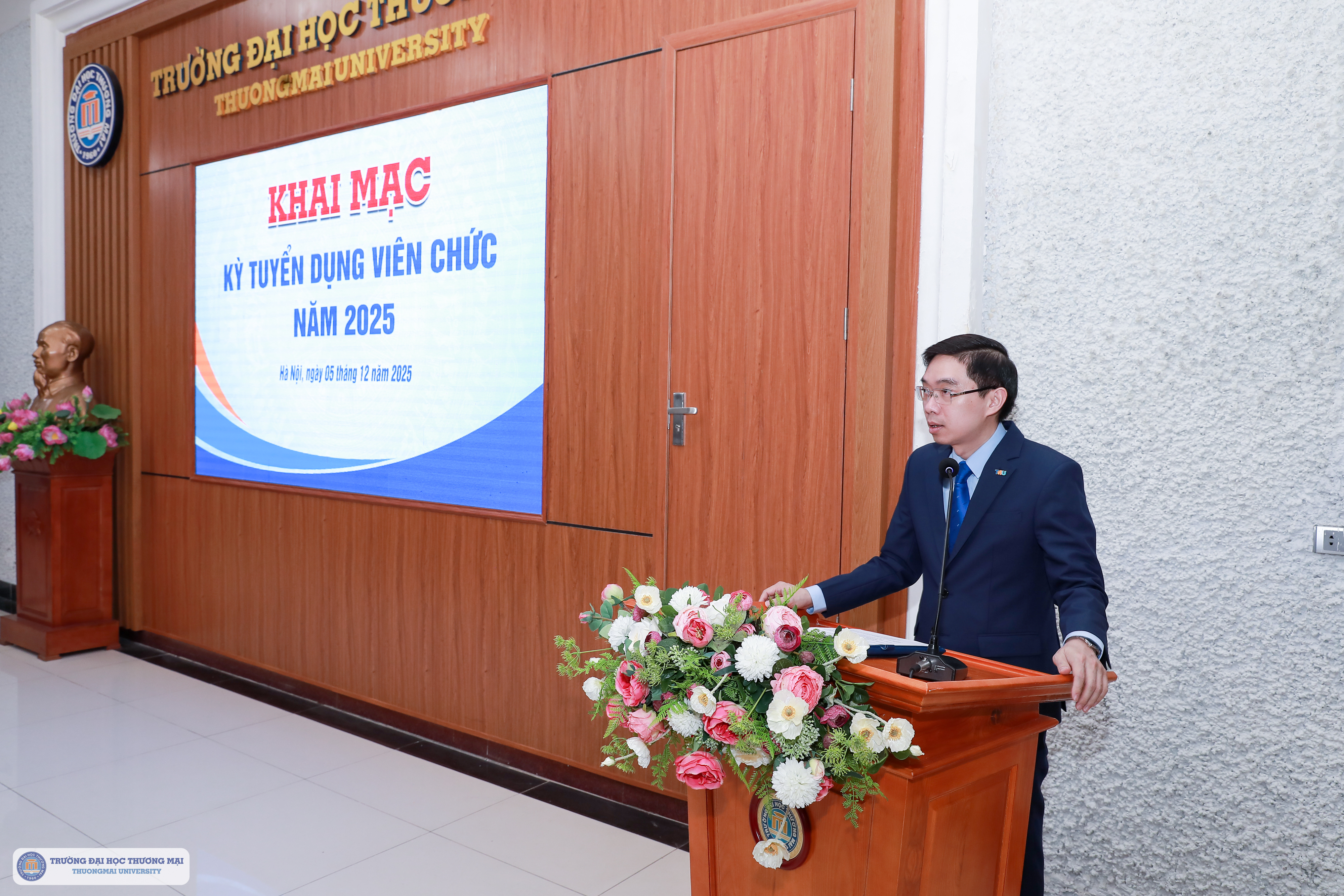 Phát biểu tại chương trình Khai mạc, GS,TS. Nguyễn Hoàng Việt – Phó Bí thư Đảng ủy, Phó Hiệu trưởng Nhà trường, Chủ tịch Hội đồng tuyển dụng viên chức 2025 đề nghị các thành viên Hội đồng tuyển dụng nghiêm túc thực hiện nội quy, quy chế đề ra, đảm bảo tính khách quan, công khai, minh bạch trong quy trình thi tuyển kỳ tuyển dụng viên chức năm 2025 của Trường Đại học Thương mại. Các bộ phận được giao nhiệm vụ đảm bảo an ninh trật tự, cơ sở vật chất cần tổ chức phục vụ tốt nhất để kỳ thi tuyển đạt kết quả cao.