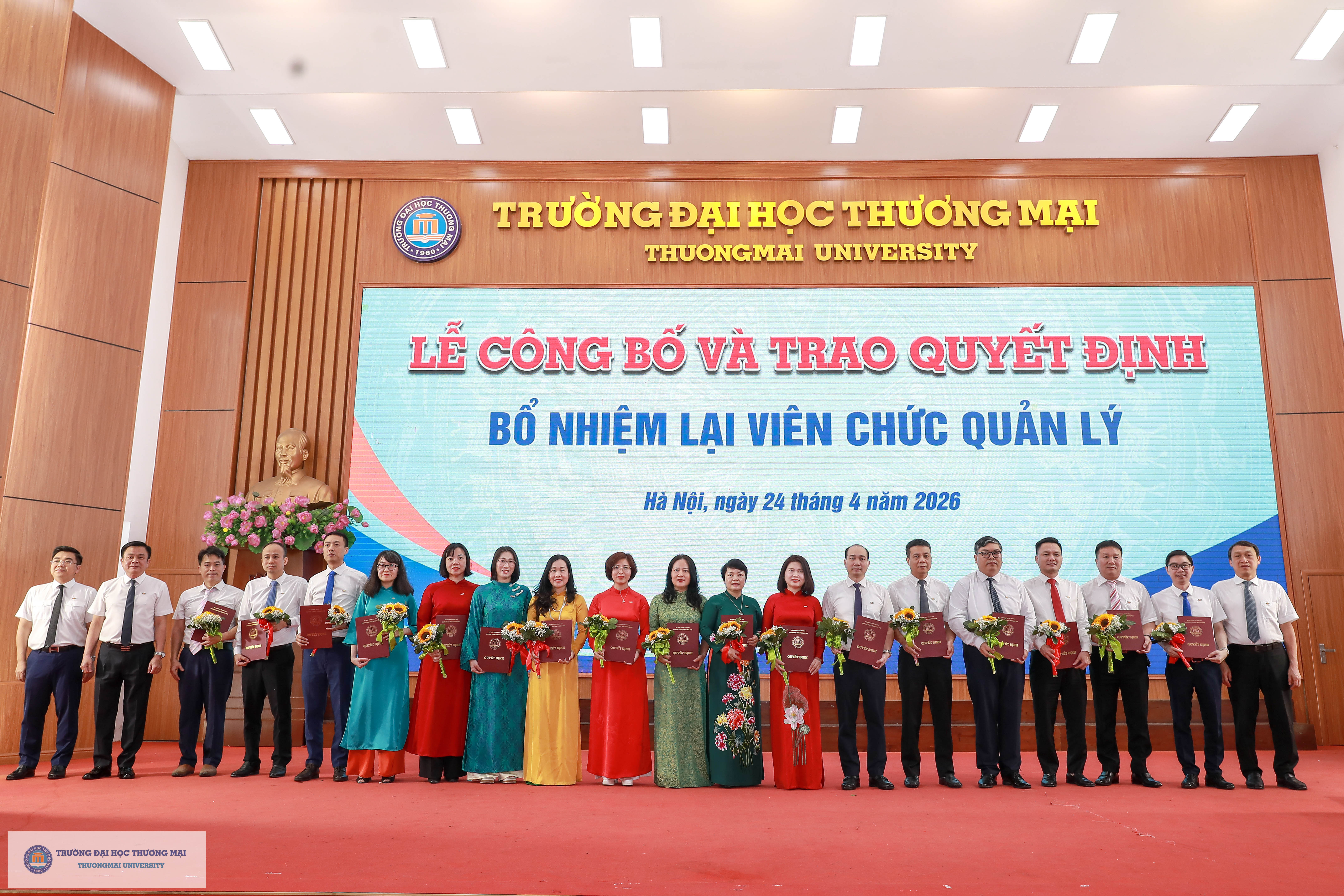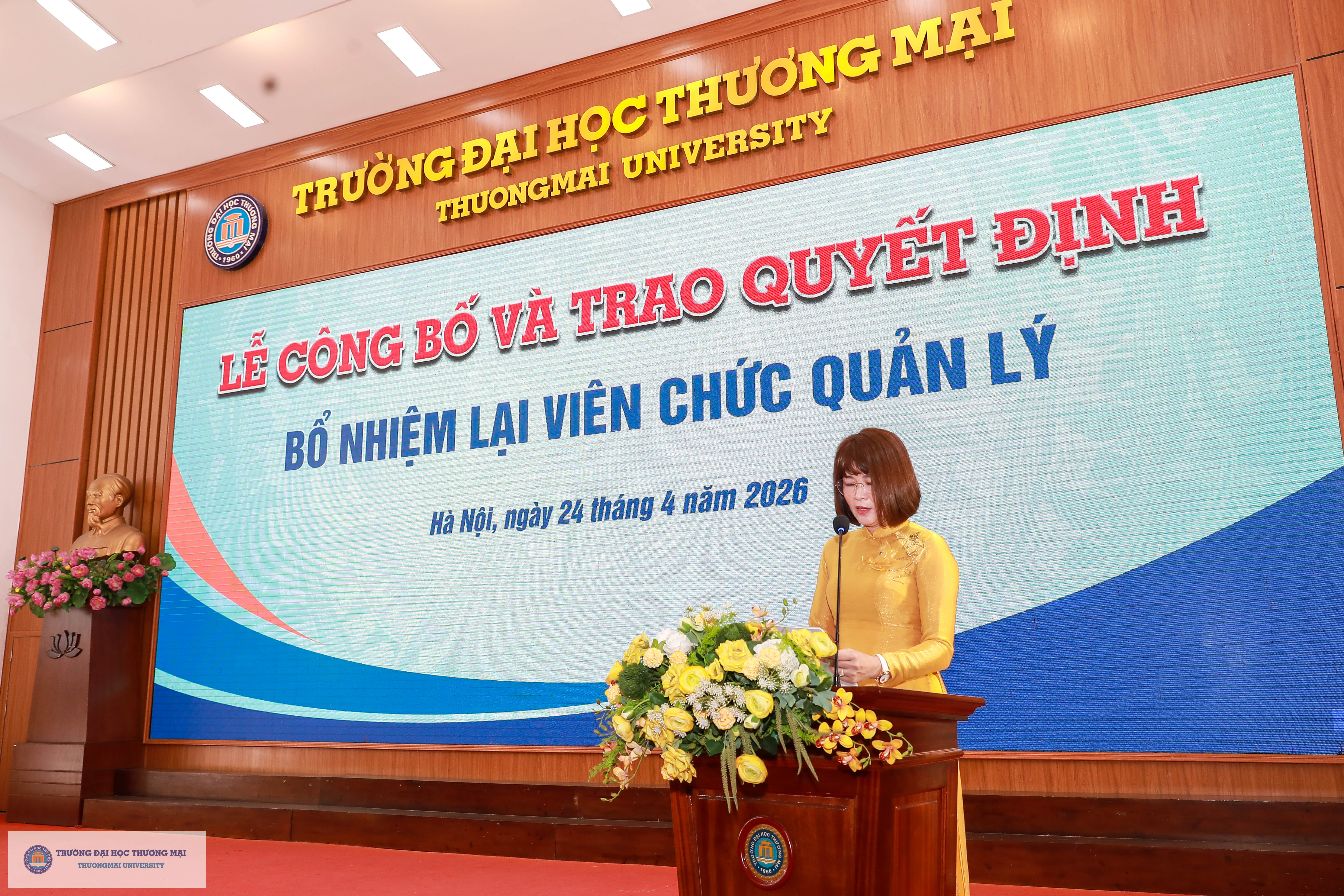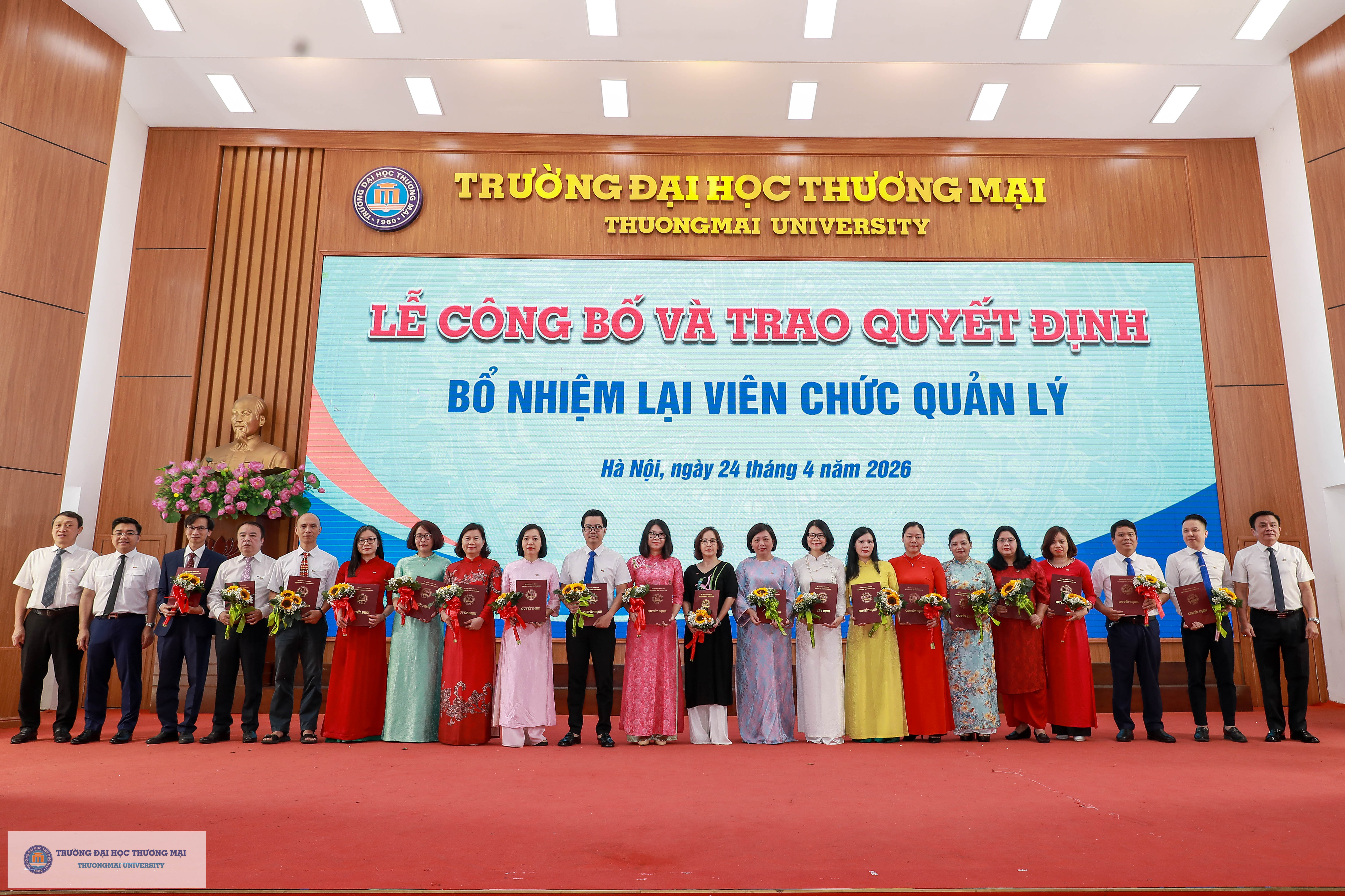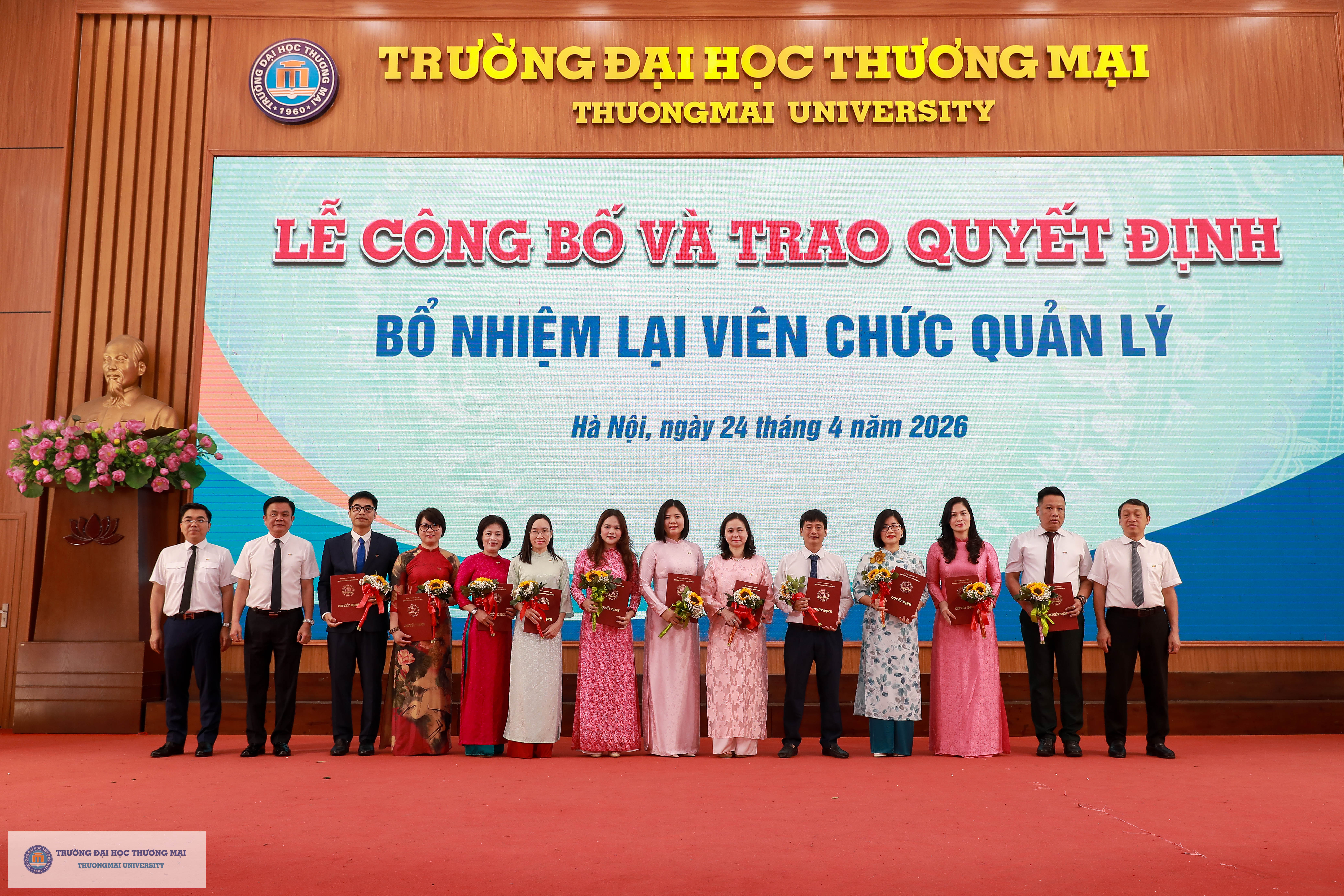Nhằm ghi nhận sự kiện có ý nghĩa đặc biệt quan trọng này, ngày 24/4/2026, Trường Đại học Thương mại long trọng tổ chức Lễ công bố và trao quyết định bổ nhiệm lại đối với 61 đồng chí viên chức quản lý; Trưởng, Phó Trưởng đơn vị cấu thành đơn vị thuộc Trường.