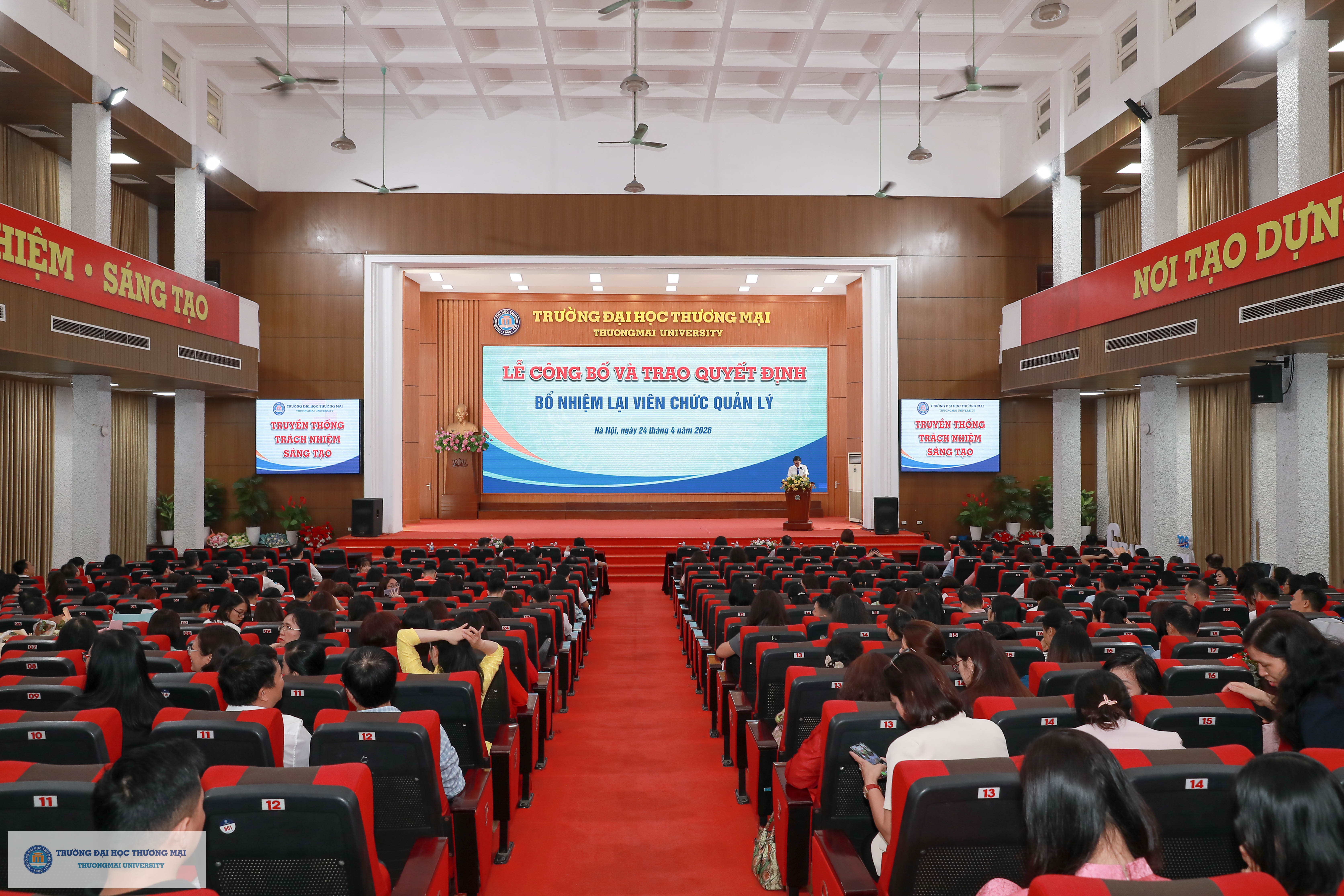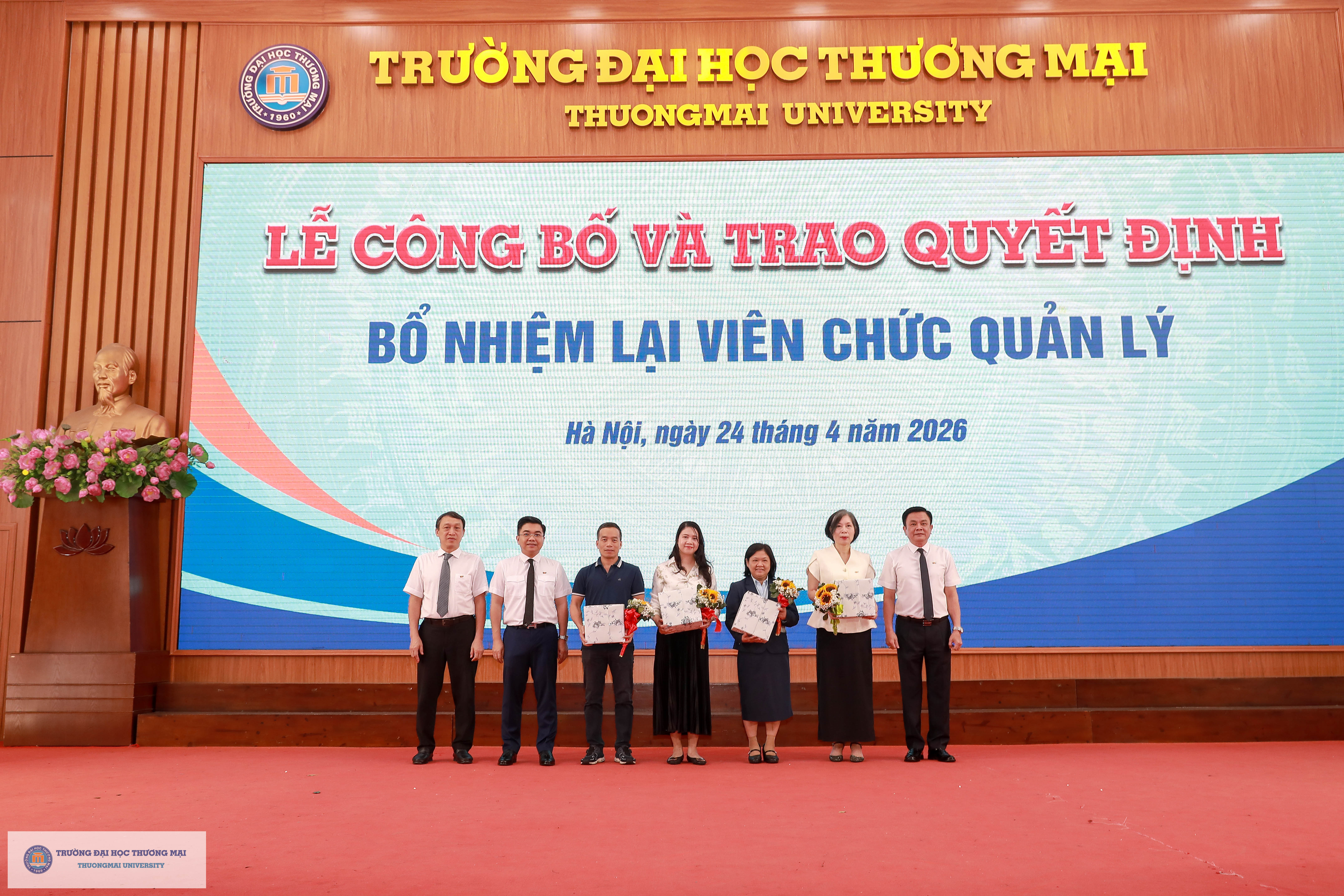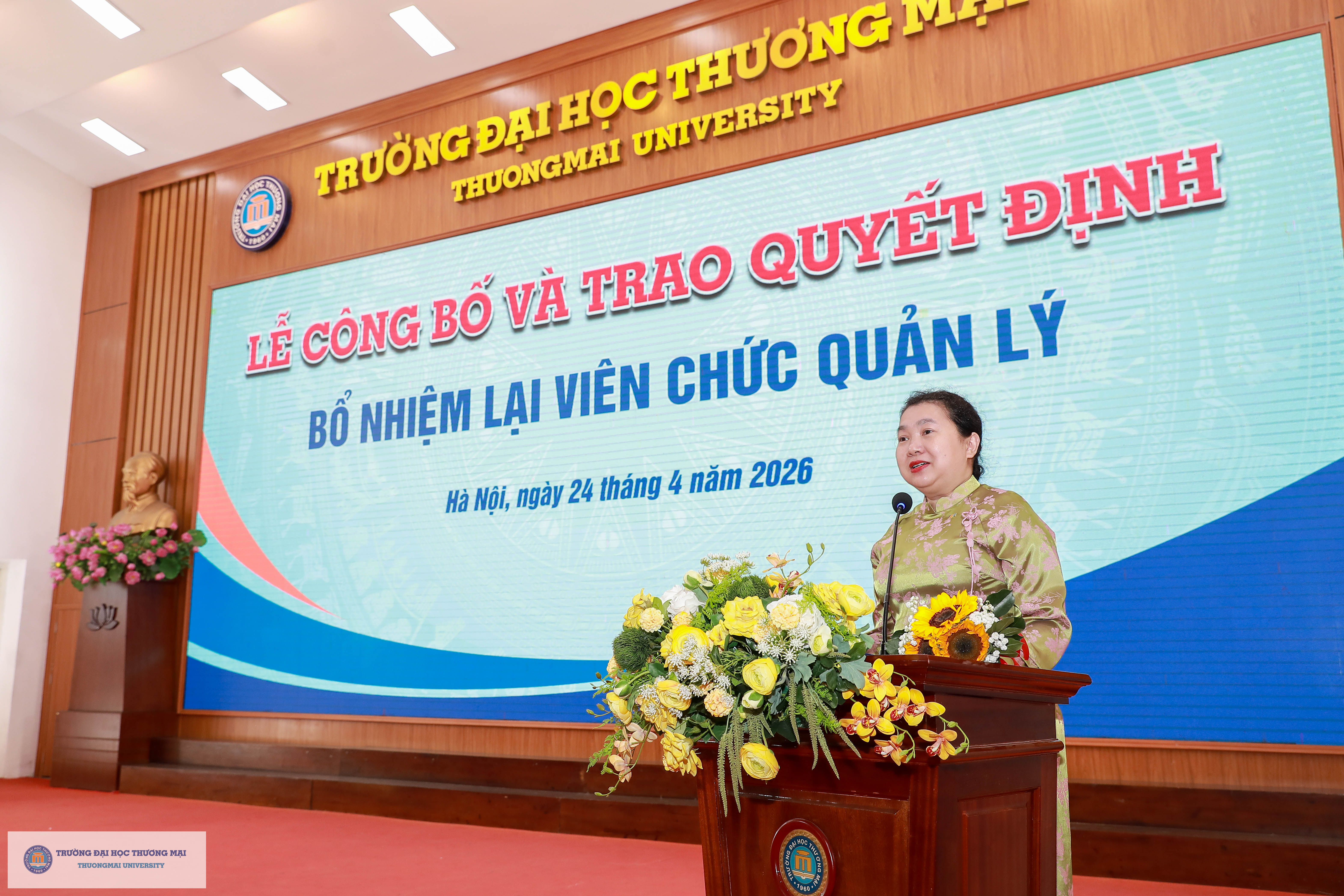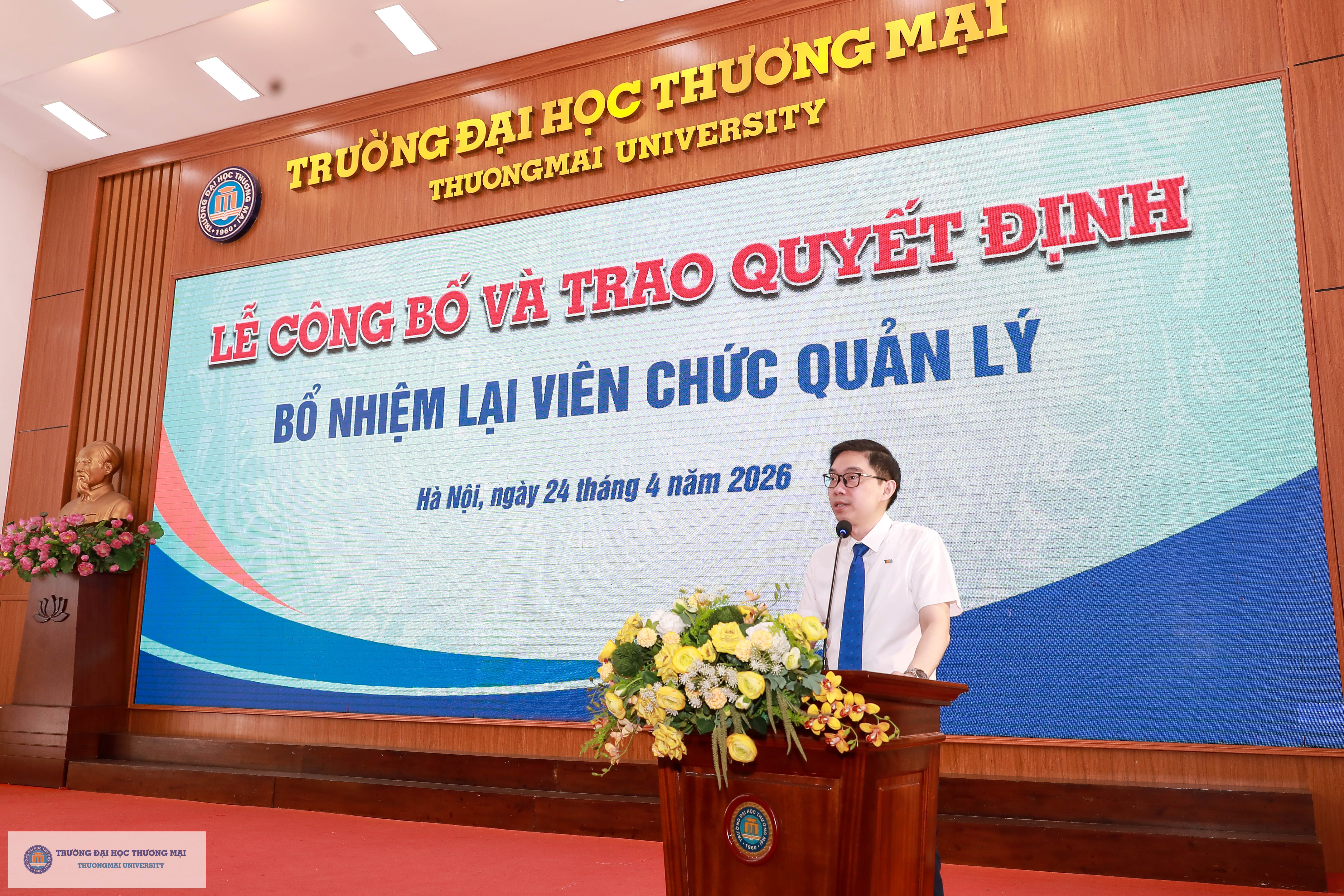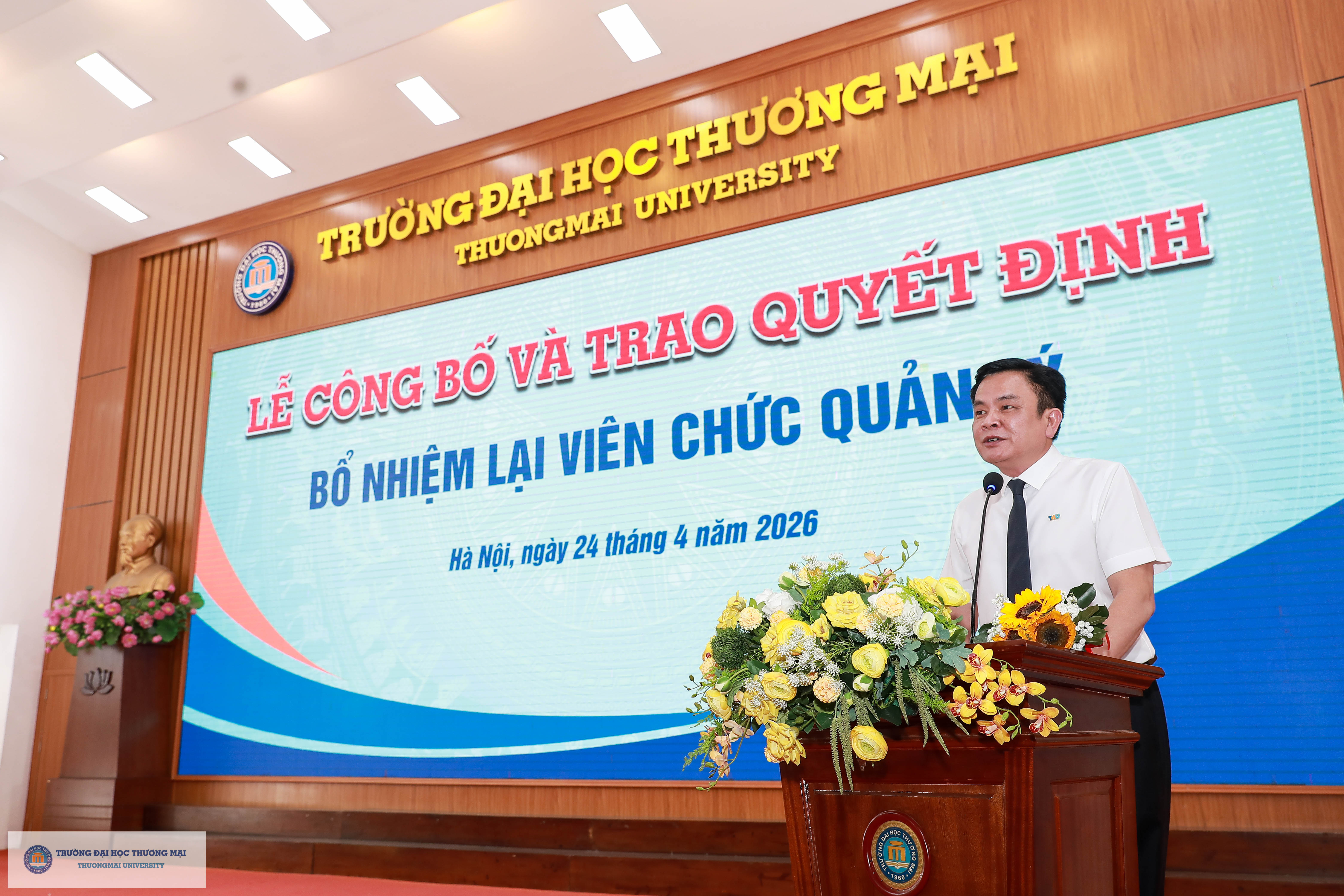 Nhằm ghi nhận sự kiện có ý nghĩa đặc biệt quan trọng này, ngày 24/4/2026, Trường Đại học Thương mại long trọng tổ chức Lễ công bố và trao quyết định bổ nhiệm lại đối với 61 đồng chí viên chức quản lý; Trưởng, Phó Trưởng đơn vị cấu thành đơn vị thuộc Trường.