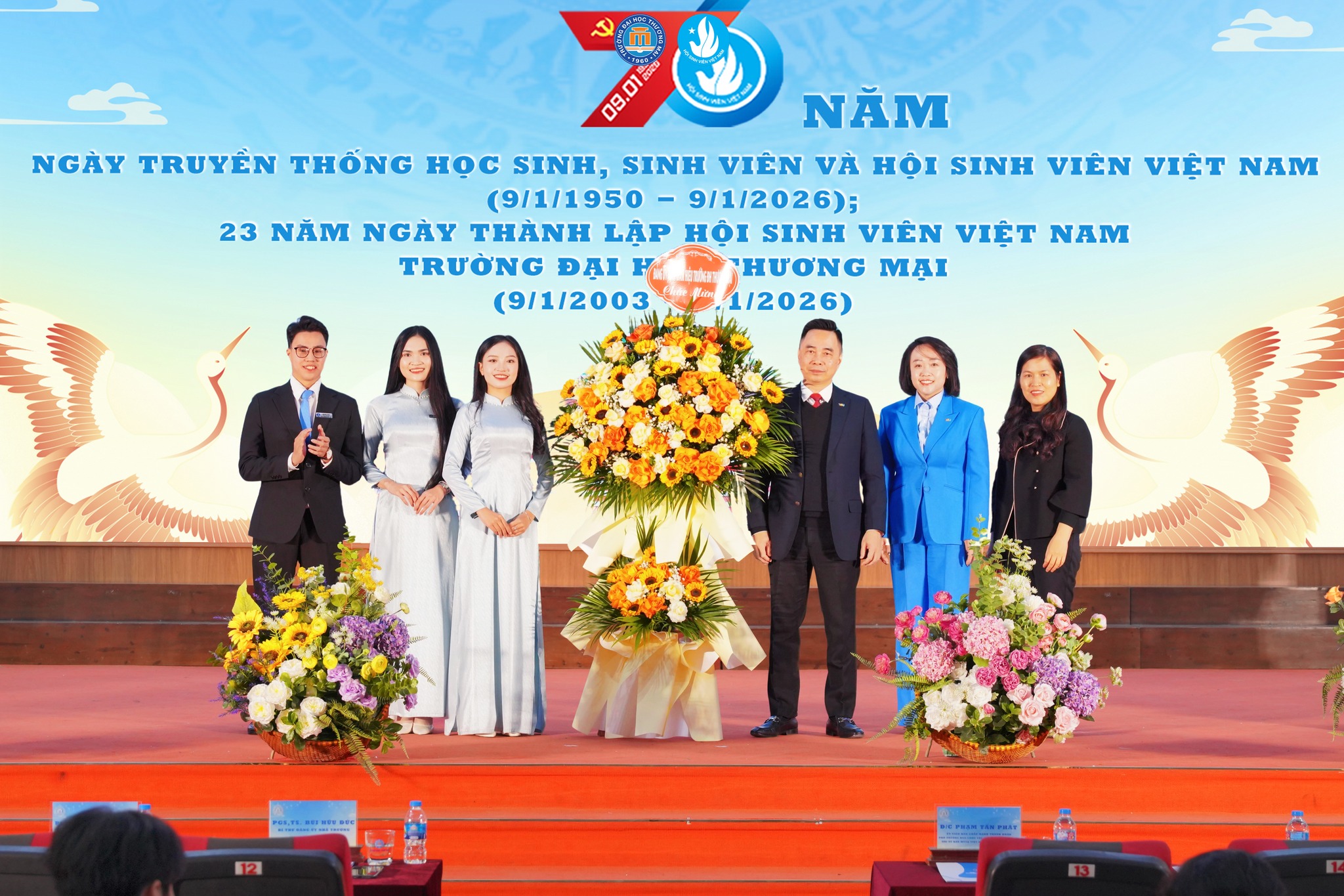 Tại buổi Lễ kỷ niệm, PGS,TS. Bùi Hữu Đức - Bí thư Đảng ủy Nhà trường đã thay mặt Lãnh đạo Nhà trường chia sẻ, ghi nhận những thành tích đáng tự hào của Hội Sinh viên Việt Nam Trường Đại học Thương mại đã đạt được trong năm học vừa qua. Đồng thời thầy cũng nhấn mạnh vai trò tiên phong của thế hệ sinh viên trong kỷ nguyên mới - kỷ nguyên vươn mình của dân tộc. Học sinh, sinh viên phải không ngừng rèn luyện bản lĩnh chính trị, đạo đức, chuyên môn và tinh thần sáng tạo, sẵn sàng đóng góp thiết thực cho cộng đồng và cho sự phát triển bền vững của đất nước.