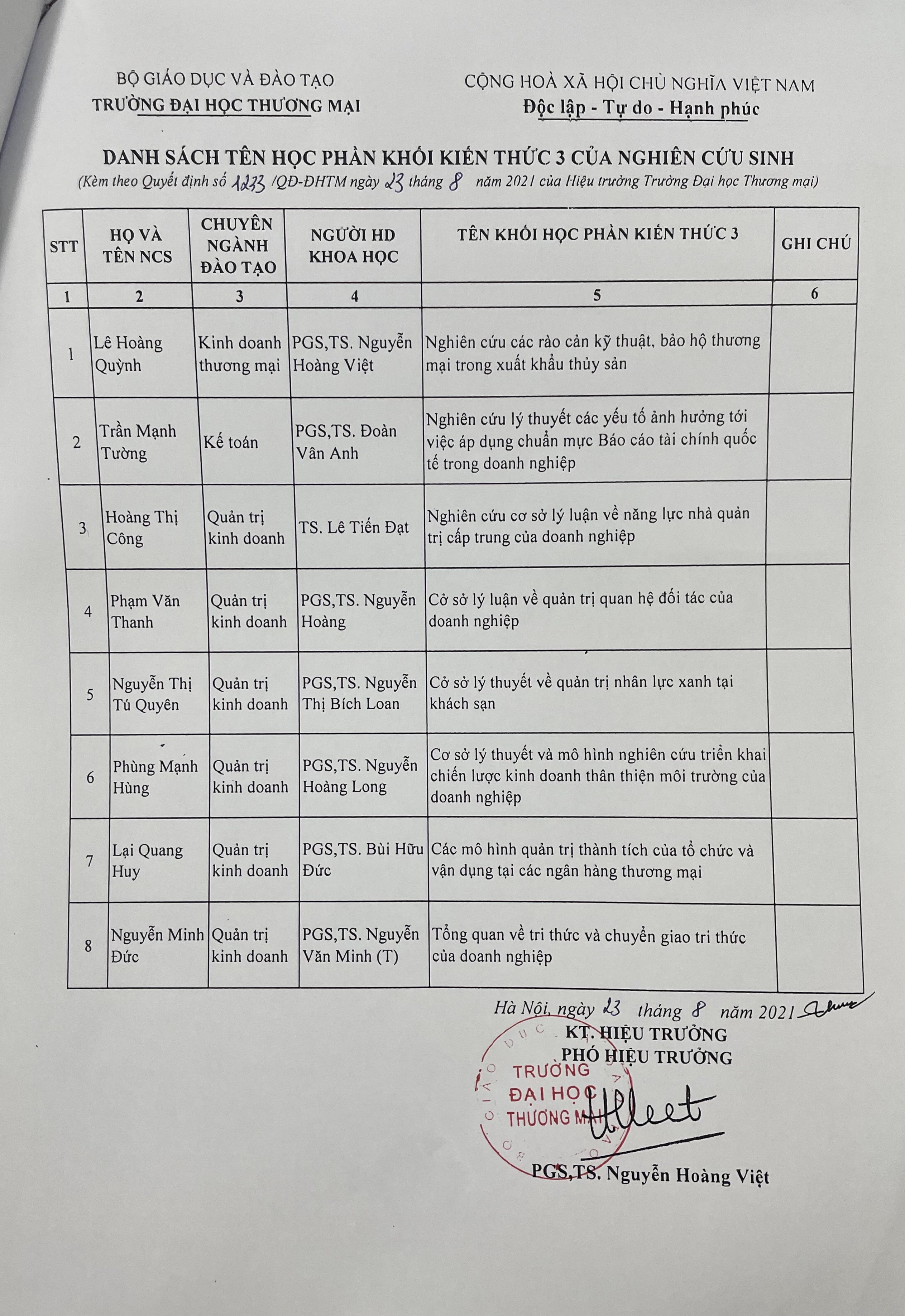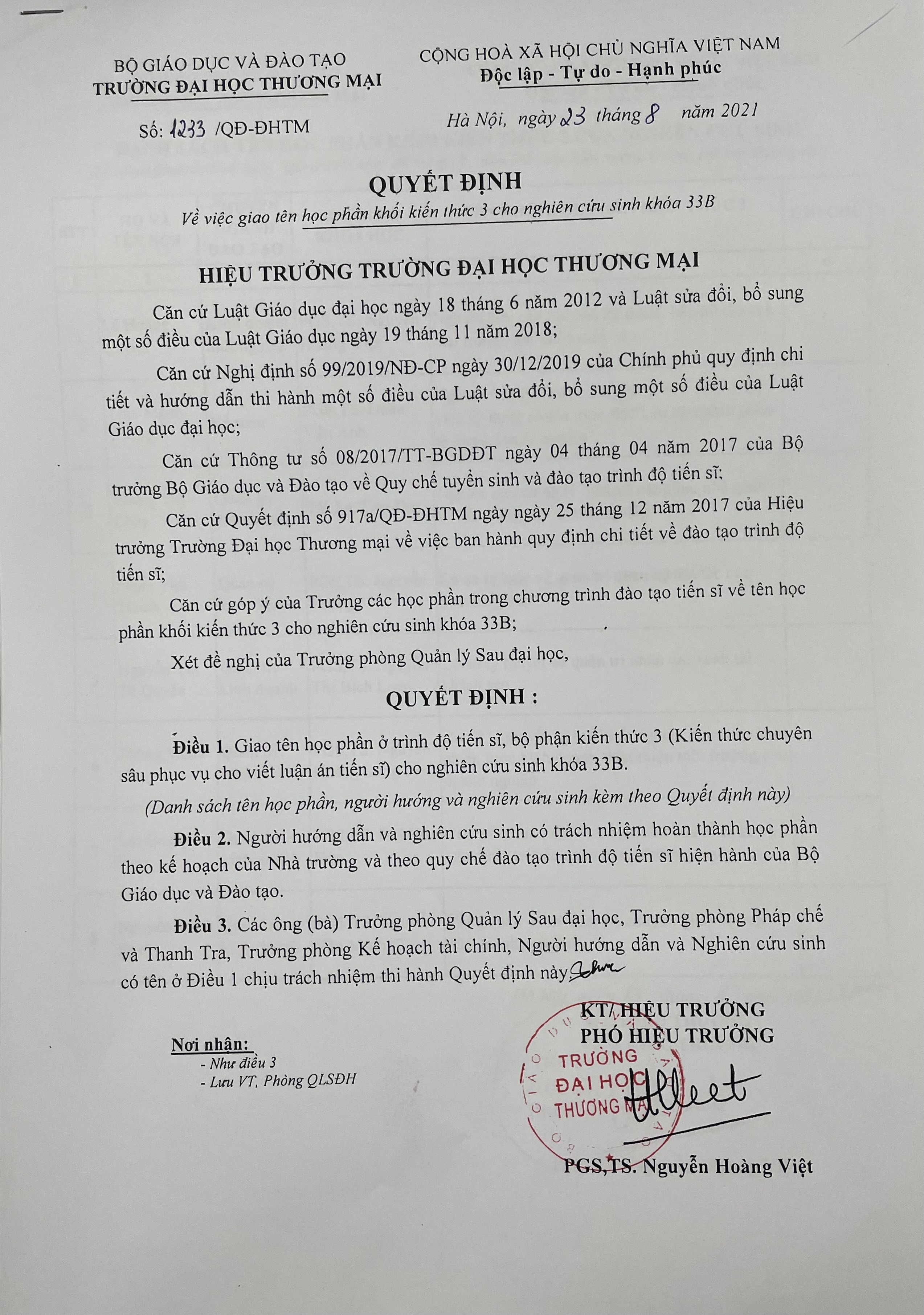 Quyết định về việc giao tên học phần khối kiến thức 3 và lịch học của nghiên cứu sinh khóa 33B