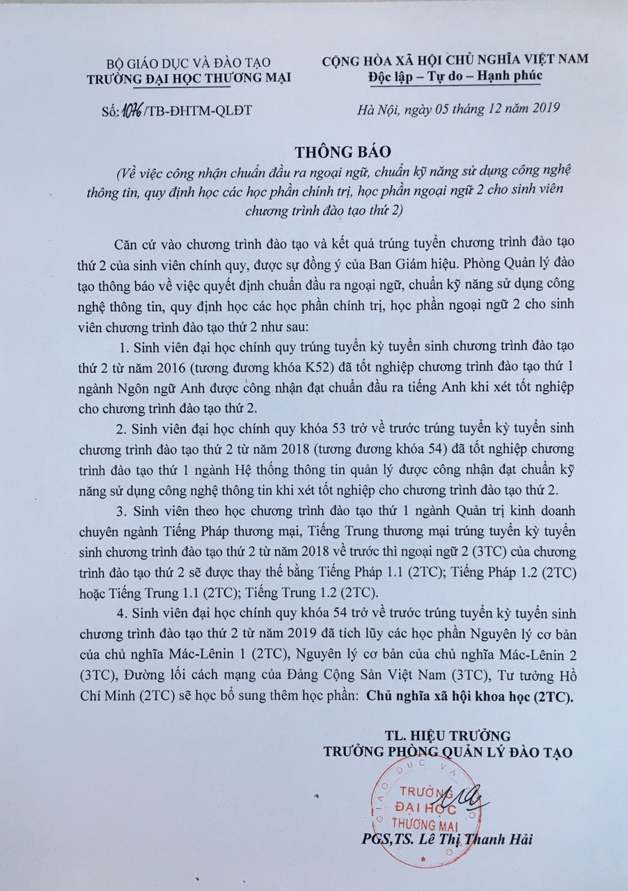 Thông báo về việc công nhận CĐR ngoại ngữ, chuẩn kỹ năng sử dụng CNTT, quy định học các học phần chính trị, học phần ngoại ngữ 2 cho sinh viên chương trình đào tạo thứ 2