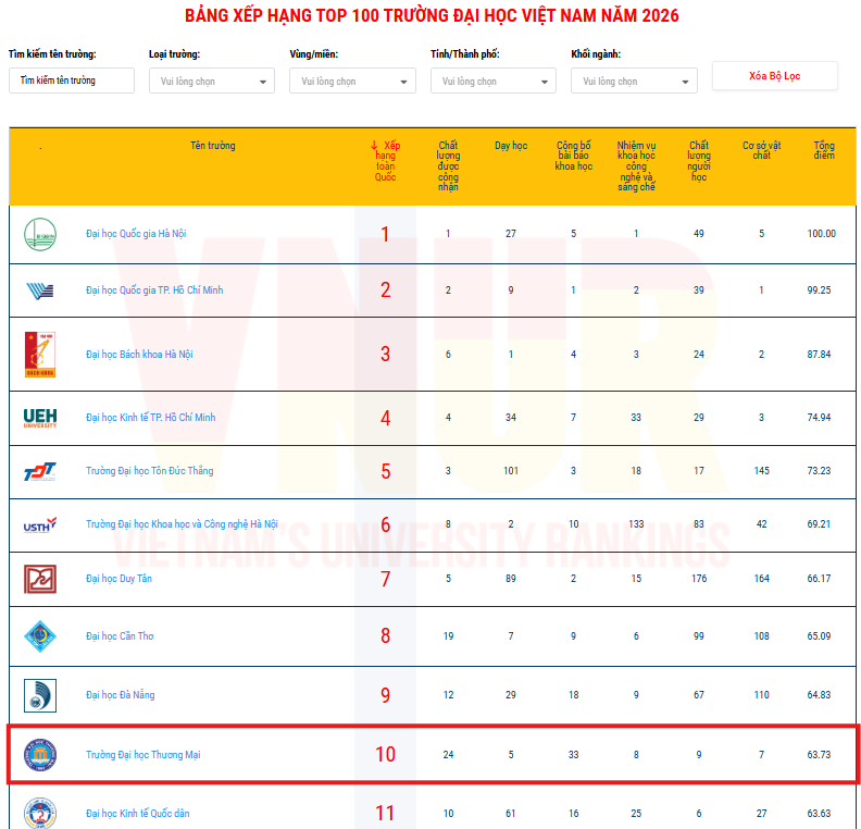 Chúc mừng Trường Đại học Thương mại vinh dự nằm trong top 10 Bảng xếp hạng Đại học Việt Nam 2026 (VNUR-2026), với các chỉ số nổi bật: Top 5 chất lượng dạy học; Top 7 về cơ sở vật chất; Top 8 trong nhiệm vụ khoa học công nghệ và sáng chế; Top 9 chất lượng người học tốt nhất.